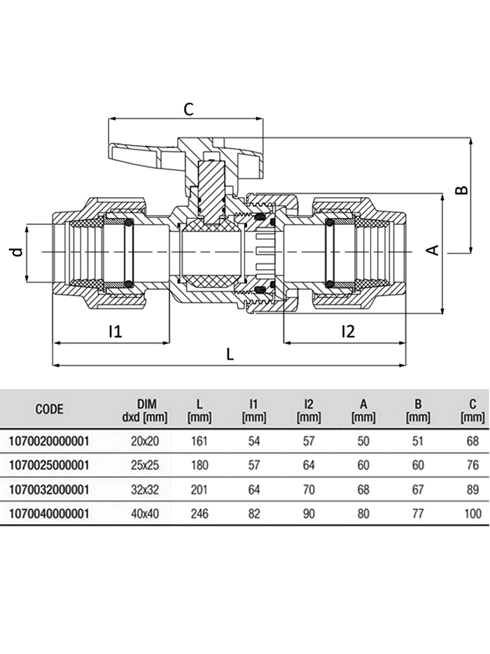 Кран шаровой для труб ПЭ UNIDELTA для труб ПЭ Ø40 x 40 PP-B (УФ защита) - компрессионный фитинг из полипропилена, обеспечивает совершенную гидравлическую герметизацию в системах распределения воды под давлением. Соединительная система состоит из присоединения полиэтиленовой трубы зажимным кольцом, которое охватывает и фиксирует трубу после того, как голубая гайка будет затянута. Технические характеристики компрессионных фитингов Unidelta делают их чрезвычайно быстрыми и легкими в монтаже. Номинальное давление - 16 бар. Основные компоненты компрессионных фитингов Unidelta изготовлены из следующих материалов: корпус, втулка и гайка — сверхпрочный полипропилен (PP-B) с УФ защитой; уплотнение — нитриловая резина (NBR); зажимное кольцо — ацеталовая смола (POM).