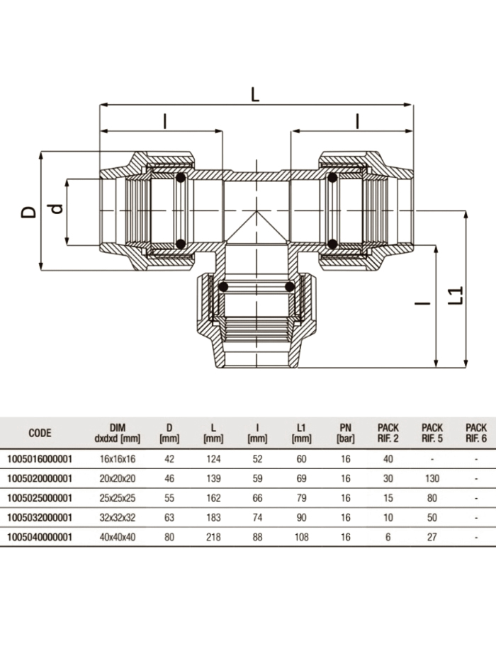1005 Тройник UNIDELTA Ø32 PN16 PP-B (УФ защита) – компрессионный фитинг из полипропилена, обеспечивает совершенную гидравлическую герметизацию в системах распределения воды под давлением. Соединительная система состоит из подсоединения полиэтиленовой трубы зажимным кольцом, охватывающим и фиксирующим трубу после того, как голубая гайка будет затянута. Технические характеристики компрессионных фитингов Unidelta делают их очень быстрыми и легкими в монтаже. Номинальное давление – 16 бар.. Основные компоненты компрессионных фитингов Unidelta изготовлены из следующих материалов: корпус, втулка и гайка – сверхпрочный полипропилен (PP-B) с УФ защитой; уплотнение – нитриловая резина (NBR); зажимное кольцо – ацеталовая смола (POM).