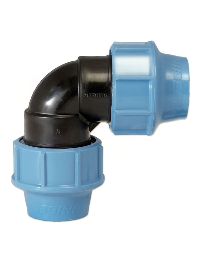 1006 Колено UNIDELTA Ø25 PN16 PP-B (УФ защита) – компрессионный фитинг из полипропилена, обеспечивает совершенную гидравлическую герметизацию в системах распределения воды под давлением. Соединительная система состоит из подсоединения полиэтиленовой трубы зажимным кольцом, охватывающим и фиксирующим трубу после того, как голубая гайка будет затянута. Технические характеристики компрессионных фитингов Unidelta делают их очень быстрыми и легкими в монтаже. Номинальное давление – 16 бар.. Основные компоненты компрессионных фитингов Unidelta изготовлены из следующих материалов: корпус, втулка и гайка – сверхпрочный полипропилен (PP-B) с УФ защитой; уплотнение – нитриловая резина (NBR); зажимное кольцо – ацеталовая смола (POM).