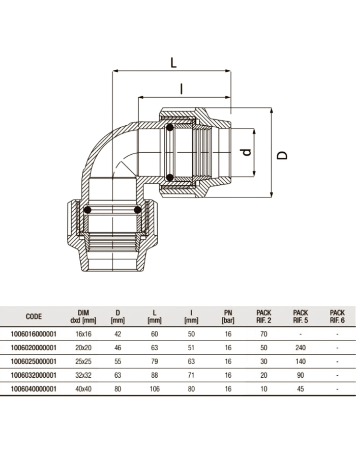 1006 Колено UNIDELTA Ø40 PN16 PP-B (УФ защита) – компрессионный фитинг из полипропилена, обеспечивает совершенную гидравлическую герметизацию в системах распределения воды под давлением. Соединительная система состоит из подсоединения полиэтиленовой трубы зажимным кольцом, охватывающим и фиксирующим трубу после того, как голубая гайка будет затянута. Технические характеристики компрессионных фитингов Unidelta делают их очень быстрыми и легкими в монтаже. Номинальное давление – 16 бар.. Основные компоненты компрессионных фитингов Unidelta изготовлены из следующих материалов: корпус, втулка и гайка – сверхпрочный полипропилен (PP-B) с УФ защитой; уплотнение – нитриловая резина (NBR); зажимное кольцо – ацеталовая смола (POM).