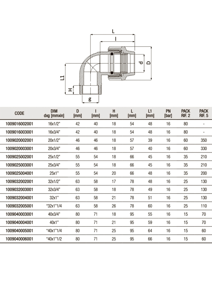 1009  UNIDELTA Колено с резьбой внутренней PN16 PP-B (УФ защита) - компрессионный фитинг из полипропилена, обеспечивает совершенную гидравлическую герметизацию в системах распределения воды под давлением. Соединительная система состоит из присоединения полиэтиленовой трубы зажимным кольцом, которое охватывает и фиксирует трубу после того, как голубая гайка будет затянута. Технические характеристики компрессионных фитингов Unidelta делают их чрезвычайно быстрыми и легкими в монтаже. Номинальное давление - 16 бар. Основные компоненты компрессионных фитингов Unidelta изготовлены из следующих материалов: корпус, втулка и гайка — сверхпрочный полипропилен (PP-B) с УФ защитой; уплотнение — нитриловая резина (NBR); зажимное кольцо — ацеталовая смола (POM).