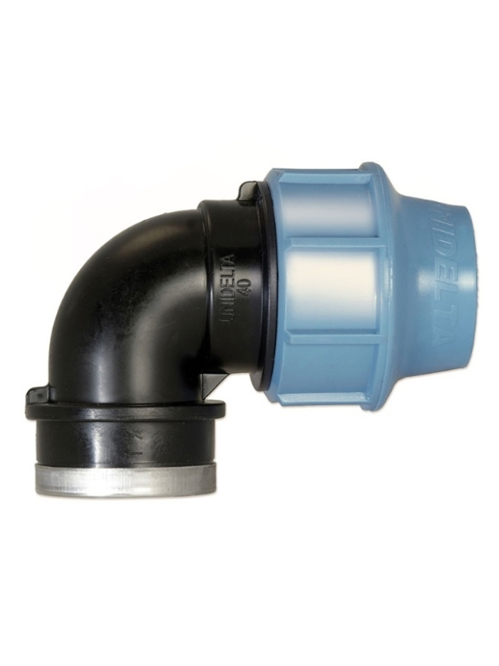 1009  UNIDELTA Колено с резьбой внутренней PN16 PP-B (УФ защита) - компрессионный фитинг из полипропилена, обеспечивает совершенную гидравлическую герметизацию в системах распределения воды под давлением. Соединительная система состоит из присоединения полиэтиленовой трубы зажимным кольцом, которое охватывает и фиксирует трубу после того, как голубая гайка будет затянута. Технические характеристики компрессионных фитингов Unidelta делают их чрезвычайно быстрыми и легкими в монтаже. Номинальное давление - 16 бар. Основные компоненты компрессионных фитингов Unidelta изготовлены из следующих материалов: корпус, втулка и гайка — сверхпрочный полипропилен (PP-B) с УФ защитой; уплотнение — нитриловая резина (NBR); зажимное кольцо — ацеталовая смола (POM).