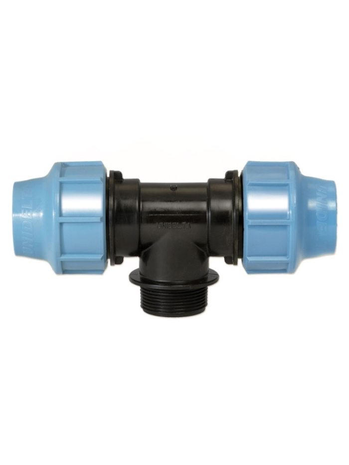 1010  UNIDELTA  Тройник с резьбой наружной  PN16 PP-B (УФ защита) - компрессионный фитинг из полипропилена, обеспечивает совершенную гидравлическую герметизацию в системах распределения воды под давлением. Соединительная система состоит из присоединения полиэтиленовой трубы зажимным кольцом, которое охватывает и фиксирует трубу после того, как голубая гайка будет затянута. Технические характеристики компрессионных фитингов Unidelta делают их чрезвычайно быстрыми и легкими в монтаже. Номинальное давление - 16 бар. Основные компоненты компрессионных фитингов Unidelta изготовлены из следующих материалов: корпус, втулка и гайка — сверхпрочный полипропилен (PP-B) с УФ защитой; уплотнение - нитриловая резина (NBR); зажимное кольцо — ацеталовая смола (POM).