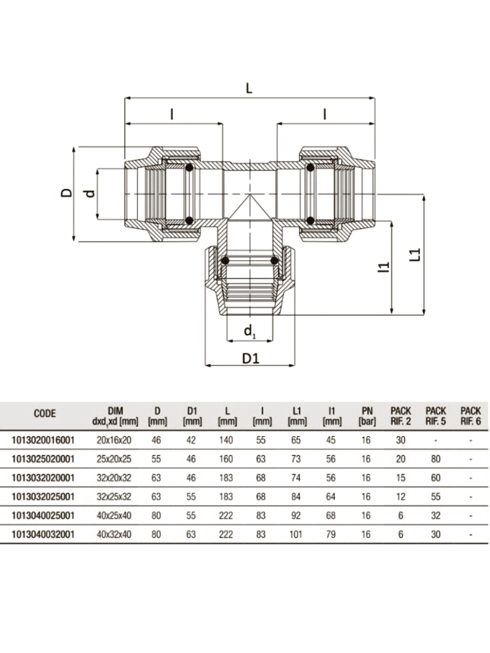 1013 UNIDELTA Тройник редукционный Ø25 х 20 х 25 PN16 PP-B (УФ защита) - компрессионный фитинг из полипропилена, обеспечивает совершенную гидравлическую герметизацию в системах распределения воды под давлением. Соединительная система состоит из присоединения полиэтиленовой трубы зажимным кольцом, которое охватывает и фиксирует трубу после того, как голубая гайка будет затянута. Технические характеристики компрессионных фитингов Unidelta делают их чрезвычайно быстрыми и легкими в монтаже. Номинальное давление - 16 бар. Основные компоненты компрессионных фитингов Unidelta изготовлены из следующих материалов: корпус, втулка и гайка — сверхпрочный полипропилен (PP-B) с УФ защитой; уплотнение — нитриловая резина (NBR); зажимное кольцо — ацеталовая смола (POM).