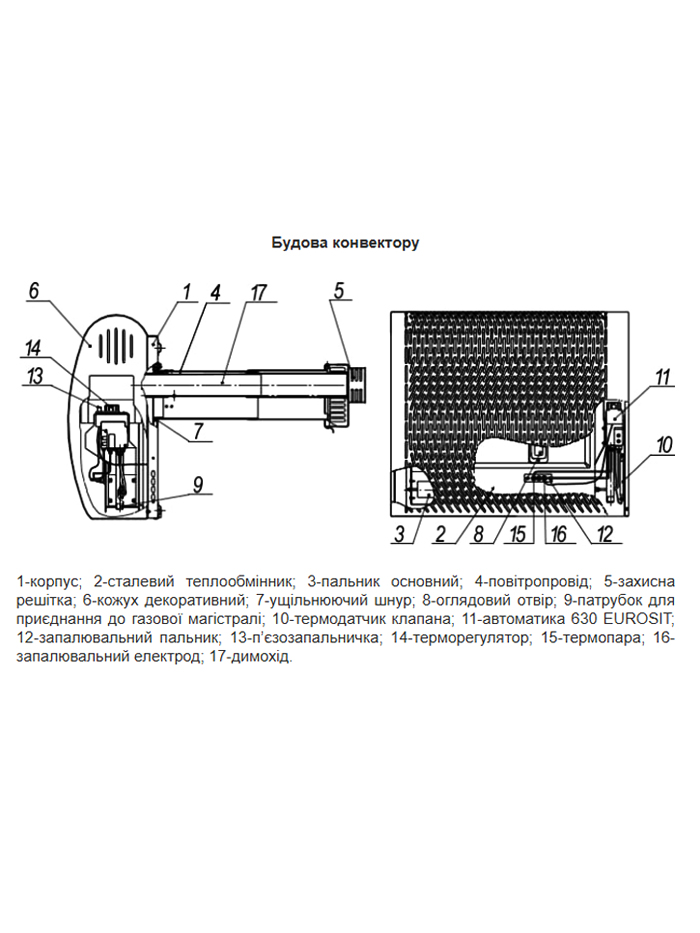 Конвектор оснащен стальным теплообменником, который внутри и снаружи покрыт слоем эмали для защиты от огня и ржавчины. Основным регулирующим и защитным элементом конвектора есть специальный газовый клапан EUROSIT, который позволяет регулировать температуру нагрева помещения в диапазоне 13-38°С. Низкоогневая горелка конвектора изготовлена из нержавеющей стали. Простота управления обеспечивается пьезоэлектрическим разгаром (котел зажигается простым нажатием кнопки). Конструкция облицовки конвектора обеспечивает беспрепятственную конвекцию горячего воздуха.