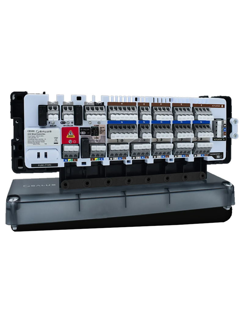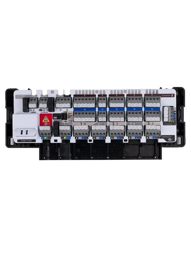 контрольный выход котла (без напряжения), выход управления тепловым насосом/чилером (без напряжения), управление насосом (AC 230V), приводы (AC 230V)
