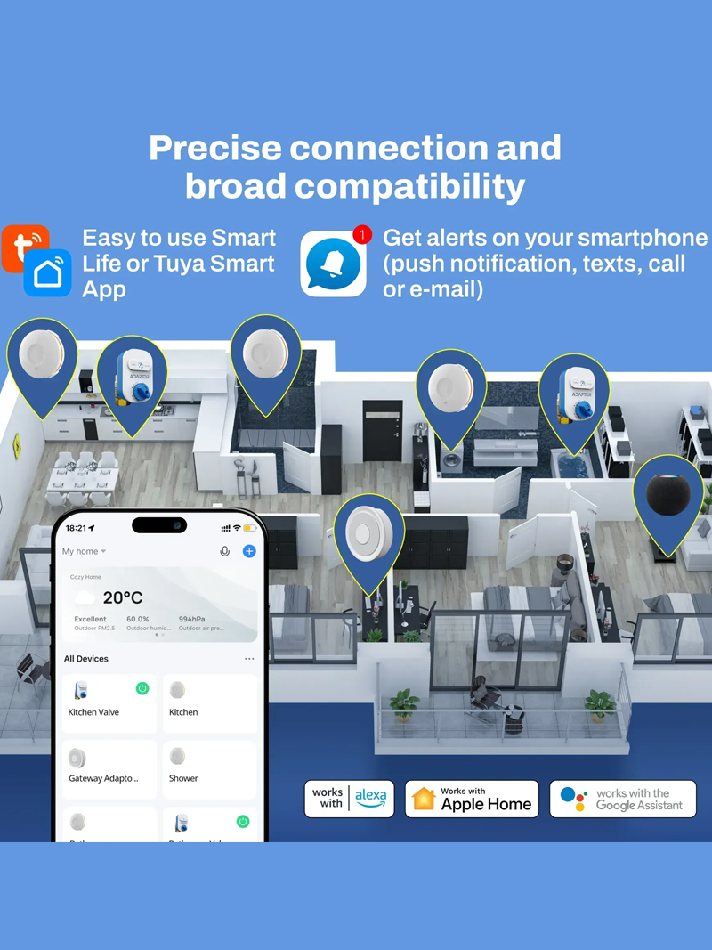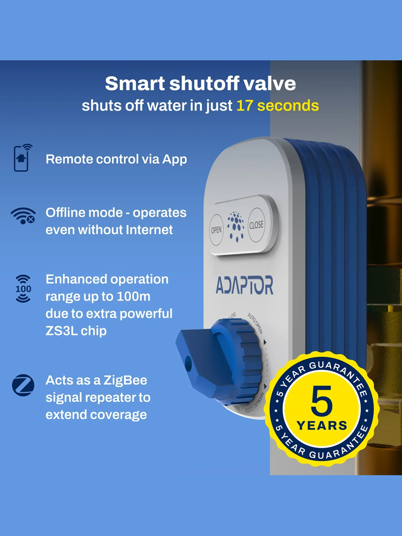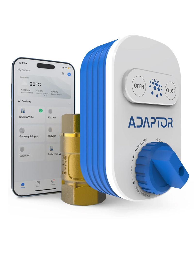 Защитите свой дом от протечек автоматически. Электроклапан ADAPTOR BSP20ZB перекрывает воду сразу после сигнала из сенсора утечки. Работает даже без Интернета. Совместим с популярными платформами – Tuya, Smart Life, Alexa, Google Assistant, Apple HomeKit.