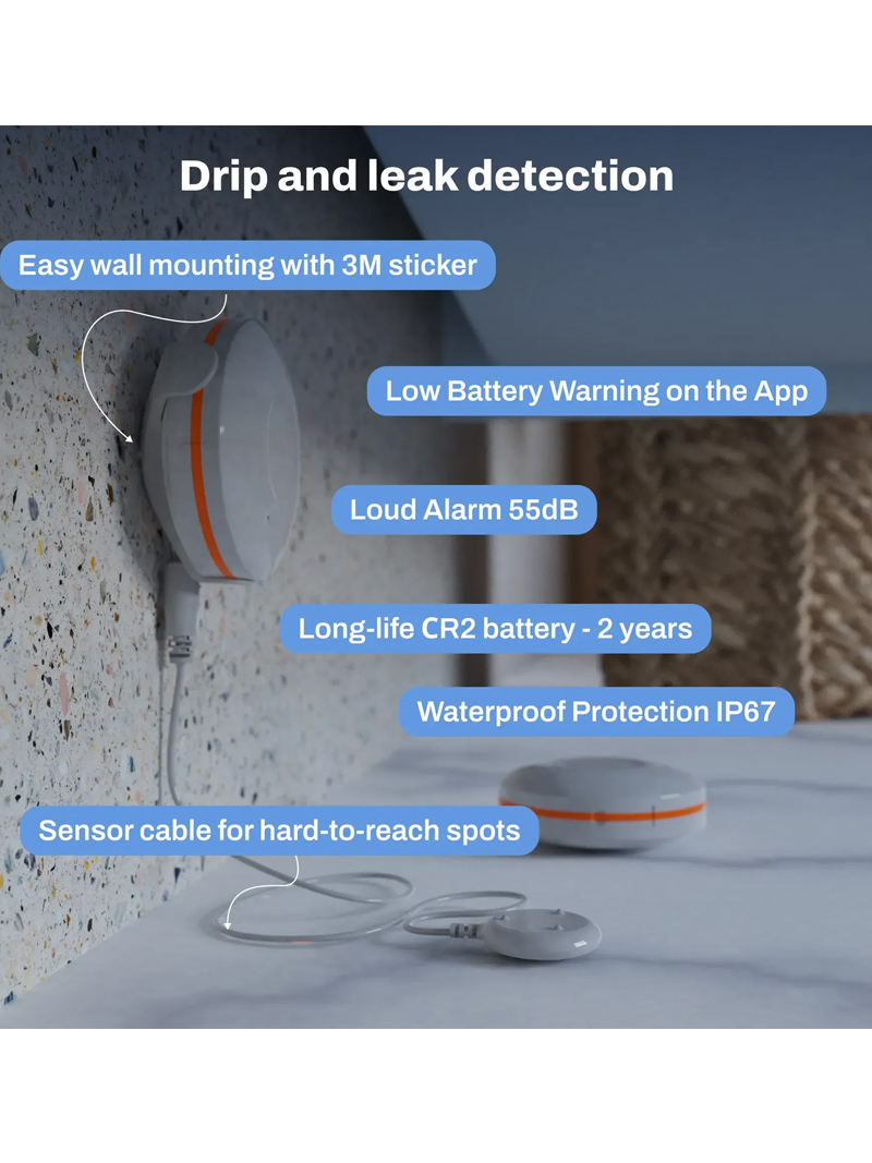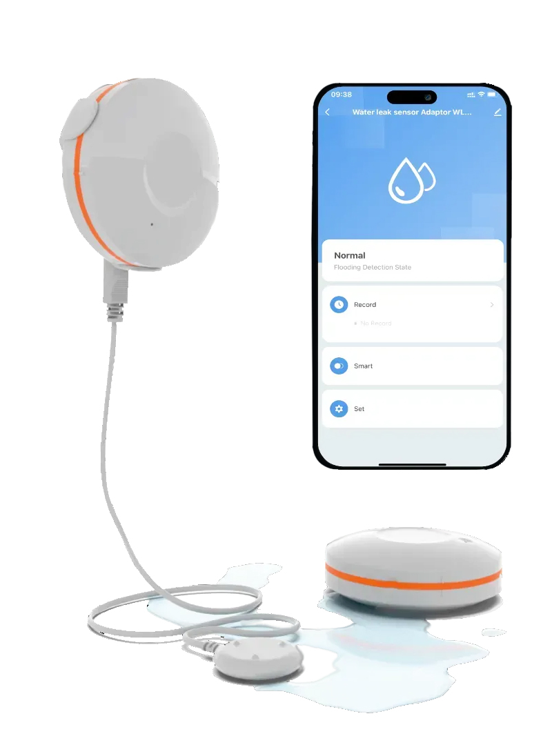 Беспроводной датчик обнаружения утечки воды. При обнаружении протечки передает сигнал к клапану для закрытия протока воды.