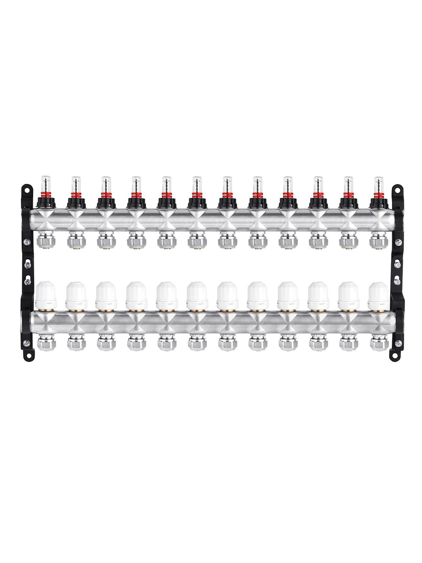 Коллектор изготовлен из нержавеющей стали, благодаря чему отличается высокой прочностью, устойчивостью к коррозии и длительным сроком службы даже при интенсивной эксплуатации. Конструкция предусматривает 12 выходов для подключения отдельных контуров, что позволяет эффективно управлять распределением теплоносителя в больших отопительных системах.