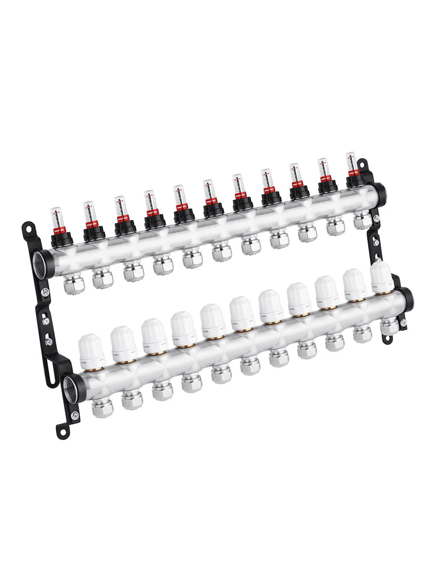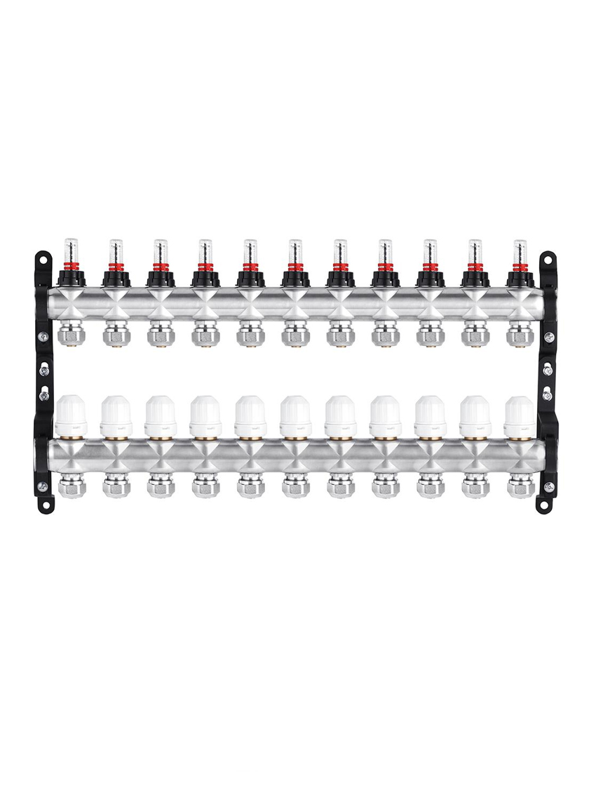 Коллектор изготовлен из нержавеющей стали, благодаря чему отличается высокой прочностью, устойчивостью к коррозии и длительным сроком службы даже при интенсивной эксплуатации. Конструкция предусматривает 11 выходов для подключения отдельных контуров, что позволяет эффективно управлять распределением теплоносителя в больших отопительных системах.