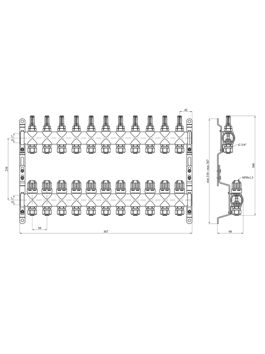 Модель оснащена расходомерами и термовентилями, которые дают возможность регулировать поток теплоносителя и балансировать систему для более стабильной и экономичной работы отопления. Подключение осуществляется через стандартные евроконусы, обеспечивающие надежное и герметичное соединение с трубопроводом (приобретается отдельно).