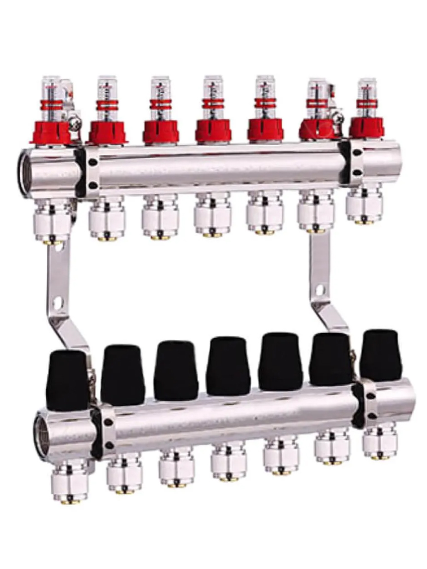 Модель оснащена расходомерами, позволяющими точно настраивать расход теплоносителя для каждого контура. Благодаря этому можно легко выполнить гидравлическую балансировку системы и обеспечить одинаковую температуру пола в разных зонах.