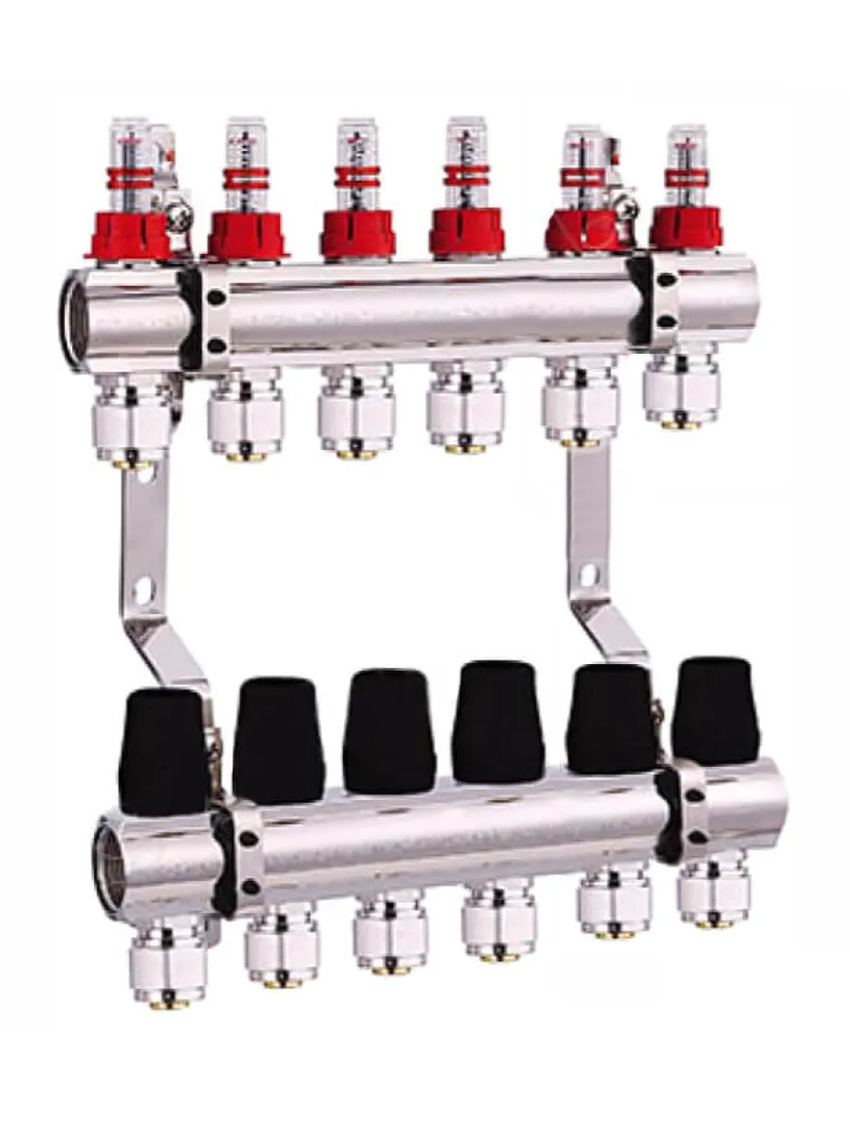 Коллектор JL для теплого пола с расходомерами на 6 выходов 1"x3/4" с евроконусом (JL2016206A) предназначен для распределения теплоносителя в системах водяного теплого пола. Устройство обеспечивает эффективное управление потоками теплоносителя в двух контурах, что позволяет равномерно распределять тепло по помещению и повышает эффективность системы отопления.