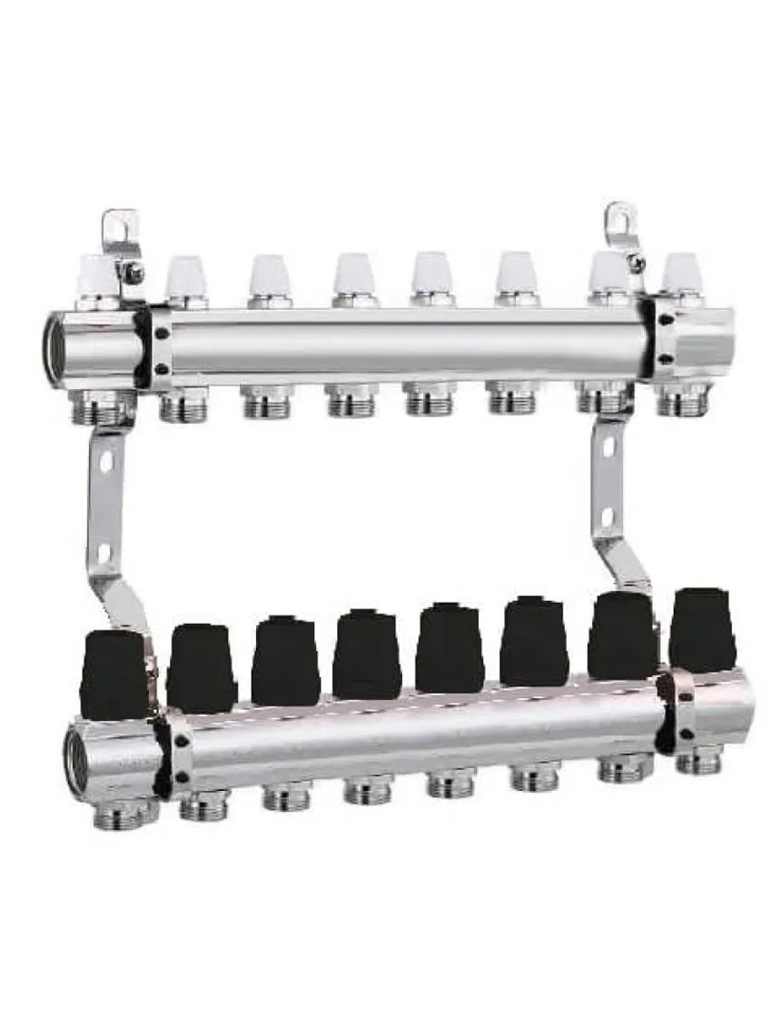 Коллектор распределительный JL на 8 выходов 1х3/4" с евроконусом без расходомеров (JL2016208B) предназначен для распределения теплоносителя в системах водяного теплого пола или радиаторного отопления. Он обеспечивает равномерную подачу теплоносителя к каждому контуру системы и позволяет удобно управлять работой.