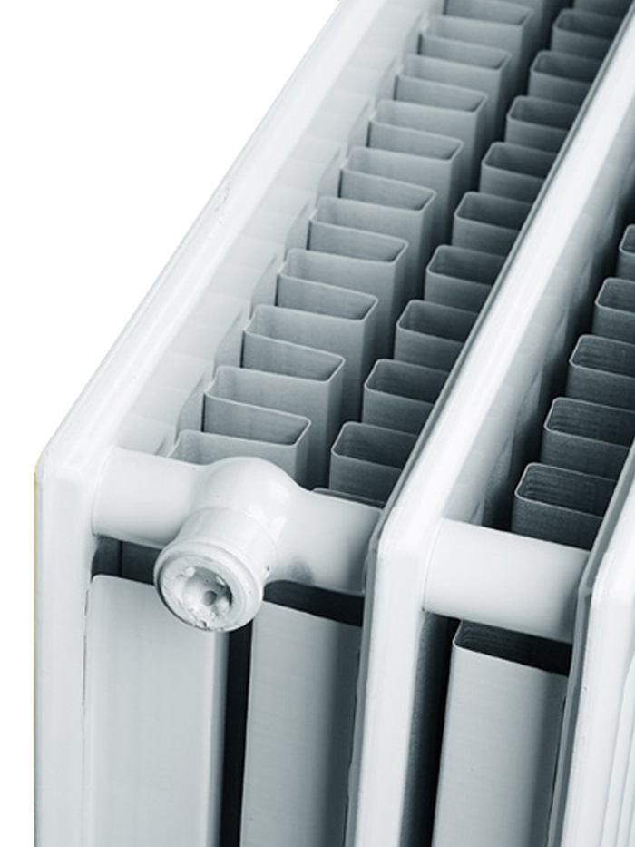 Стальные панельные радиаторы Purmo Compact имеют четыре боковых присоединительных отверстия в каждом углу радиатора с внутренней резьбой 1/2". Радиатор с конвекционными, боковые поверхности закрыты защитными элементами, верхняя поверхность закрыта планкой типа гриль.
