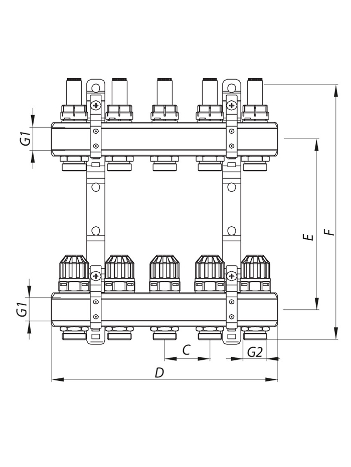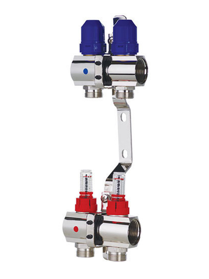 Колекторний блок із вбудованими витратомірами випускається для розподілу теплоносія до споживачів у системах водяного опалення – радіаторів, конвекторів, петлів теплої підлоги, обігріву відкритих майданчиків. На виходах прямого колектора встановлені настроювальні клапани з витратомірами, колектор зворотний оснащений термостатичними клапанами (ручні, з можливістю обладнання сервоприводами).
