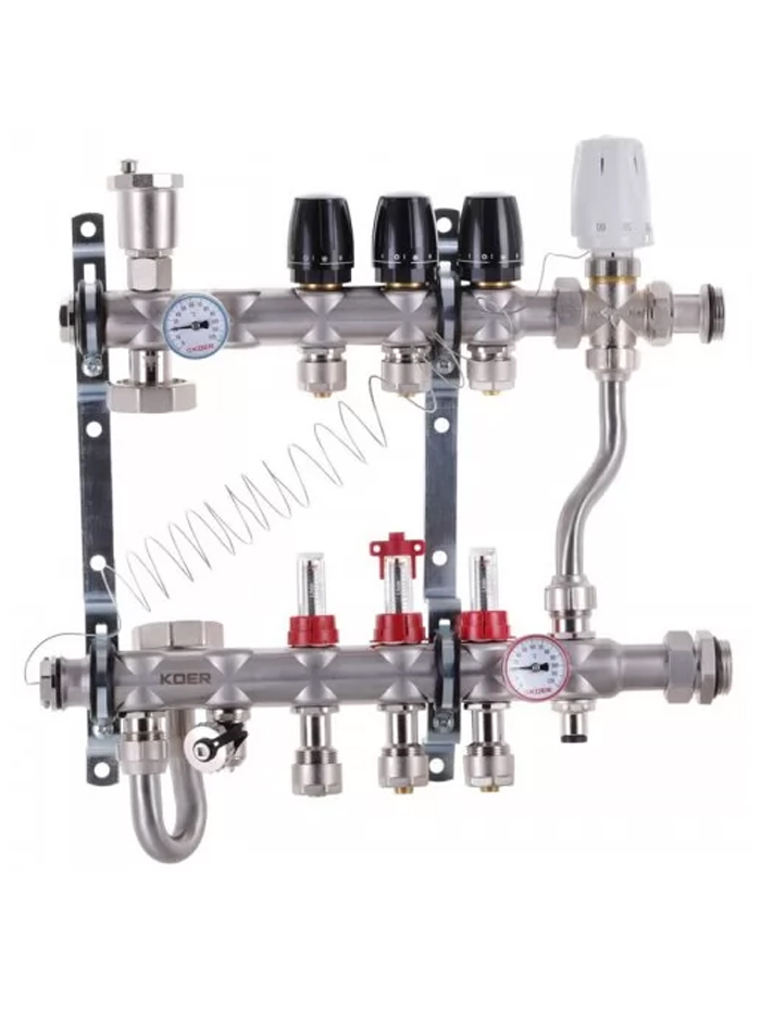 Колекторний блок служить для розподілу потоків по контурах теплої підлоги, радіаторного опалення, інших кліматичних систем, де в якості теплоносія використовується вода або розчини гліколю, що незамерзають. Колектори KOER виготовлені із високоякісної сантехнічної латуні CW617N із нікелевим покриттям.