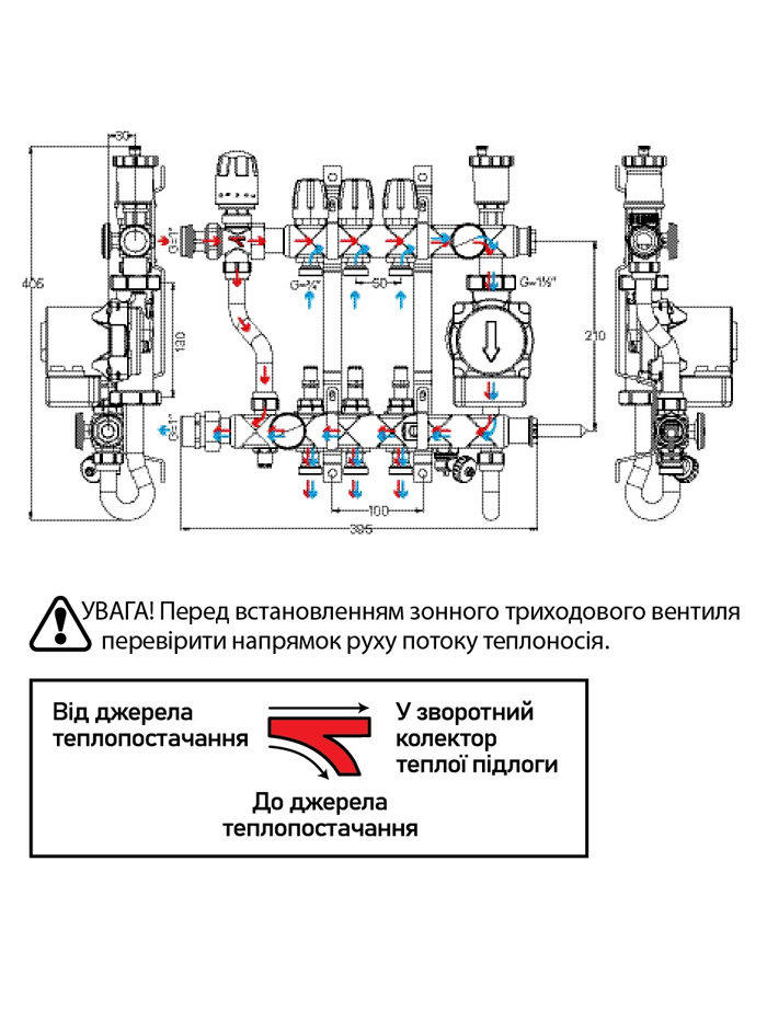 Виходи зворотного колектора блоку обладнані термостатичними, що подає – мікрометричними налаштувальними клапанами. Колектори оснащені повітровідвідниками з відсікаючими клапанами, дренажними кранами, пробками, що самоущільнюються. У комплект входять кріпильні кронштейни.
