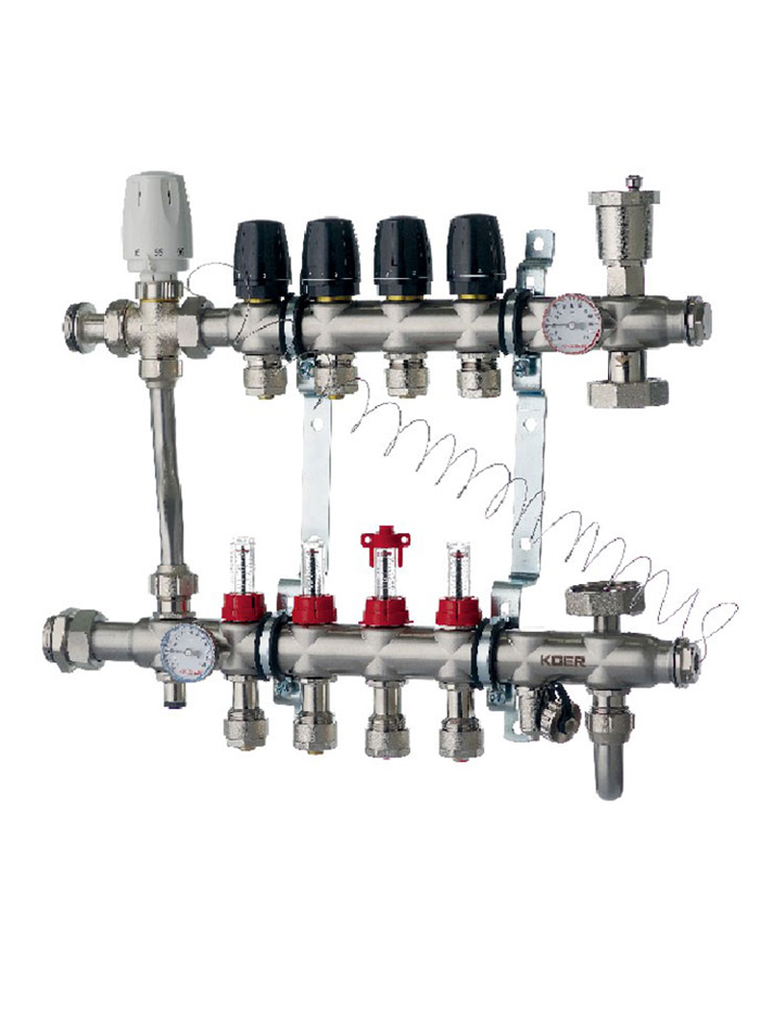 Колекторний блок служить для розподілу потоків по контурах теплої підлоги, радіаторного опалення, інших кліматичних систем, де в якості теплоносія використовується вода або розчини гліколю, що незамерзають. Колектори KOER виготовлені із високоякісної сантехнічної латуні CW617N із нікелевим покриттям.