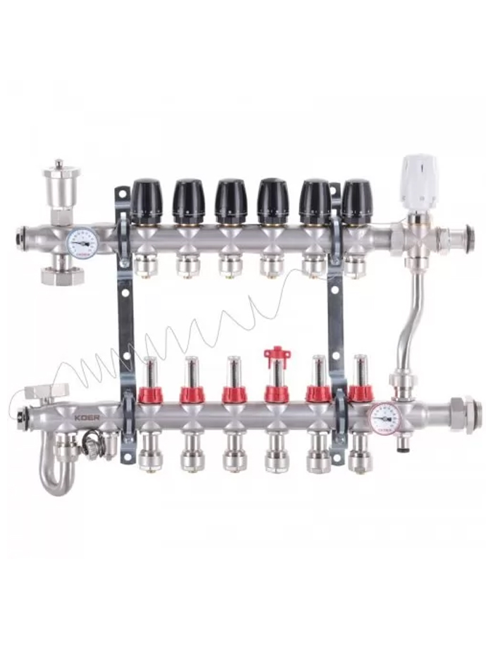 Колекторний блок служить для розподілу потоків по контурах теплої підлоги, радіаторного опалення, інших кліматичних систем, де в якості теплоносія використовується вода або розчини гліколю, що незамерзають. Колектори KOER виготовлені із високоякісної сантехнічної латуні CW617N із нікелевим покриттям.