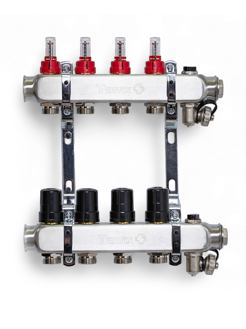 Колектор на 4 контури з витратомірами, краном Маєвського та зливним краном із нержавіючої сталі Tervix Pro Line