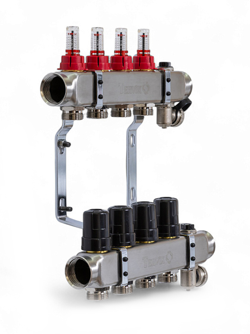 Розподільчі гребінки Tervix призначені для використання в системах «Тепла підлога». За допомогою витратомірів легко встановити розрахункову витрату теплоносія через певний контур теплої підлоги.