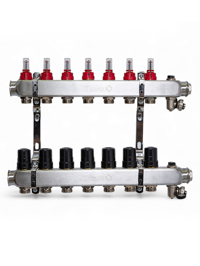 Колектор на 7 контурів з витратомірами, краном Маєвського та зливним краном із нержавіючої сталі Tervix Pro Line
