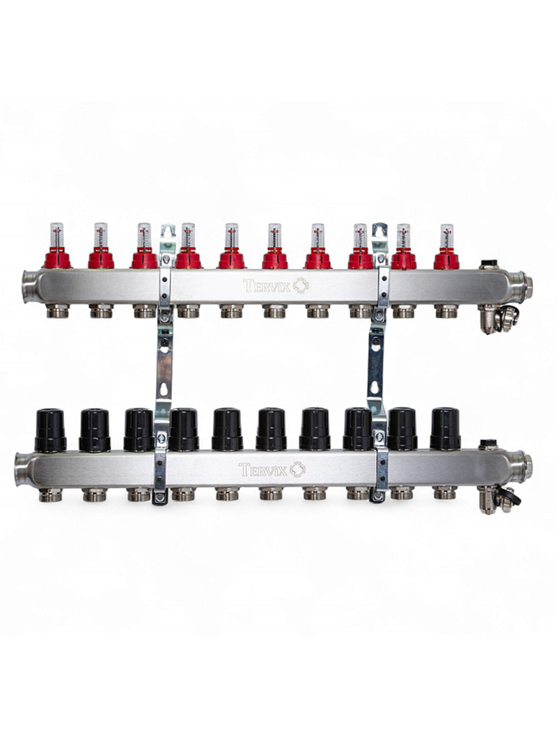 Колектор на 10 контурів з витратомірами, краном Маєвського та зливним краном із нержавіючої сталі Tervix Pro Line
