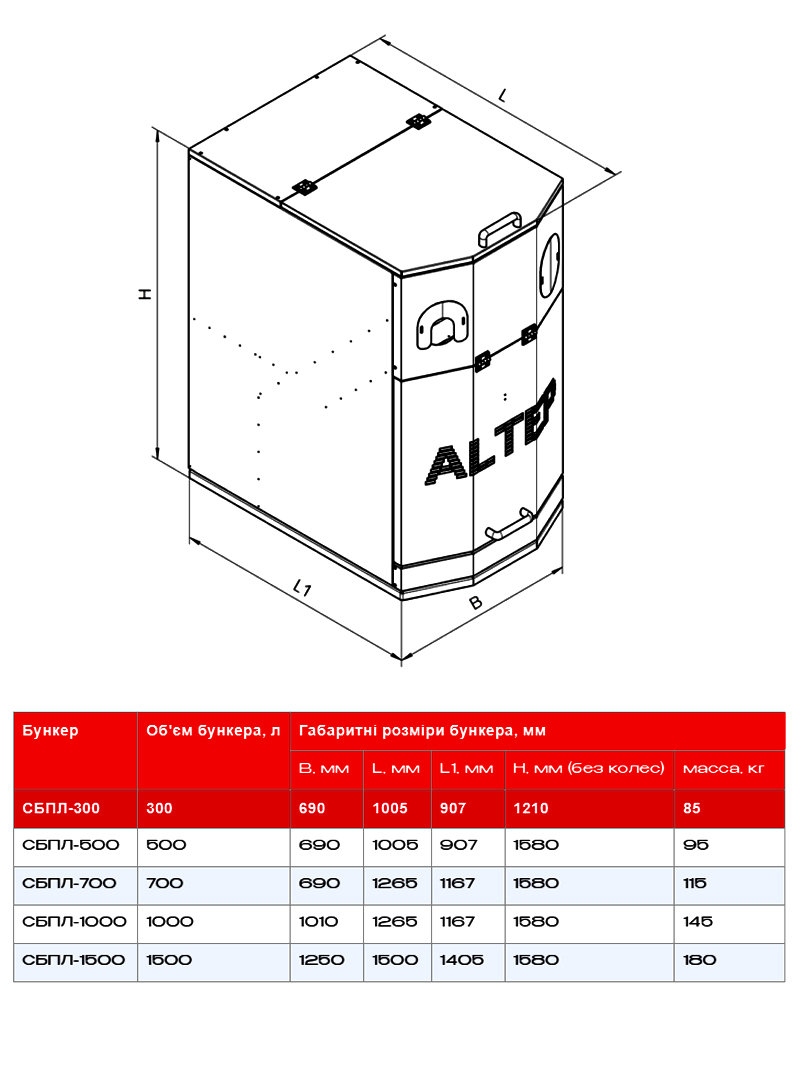 Бункер Об’єм бункера, л Габаритні розміри бункера, мм