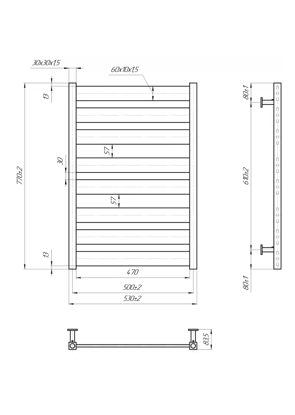 Сушка для рушників Санті виконана в кубічному стилі. Його ребра мають плоску форму, а стояки виготовлені із труби із квадратним перетином. Він складається з 8 ребер, згрупованих у три секції. Ця модель створить теплу та суху атмосферу у ванній кімнаті, а також стане стильною окрасою інтер'єру.